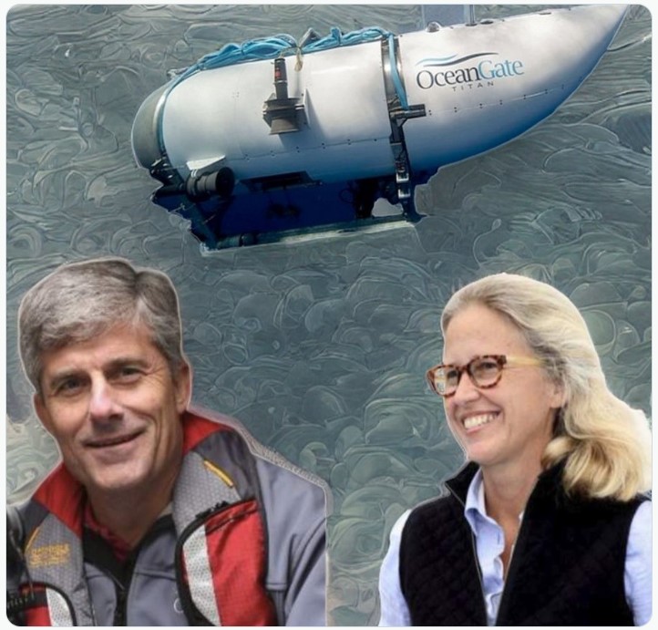 駕駛員羅許和他的妻子溫蒂,以及背後的小型觀光潛水艇Titan。(翻拍自推特網頁)